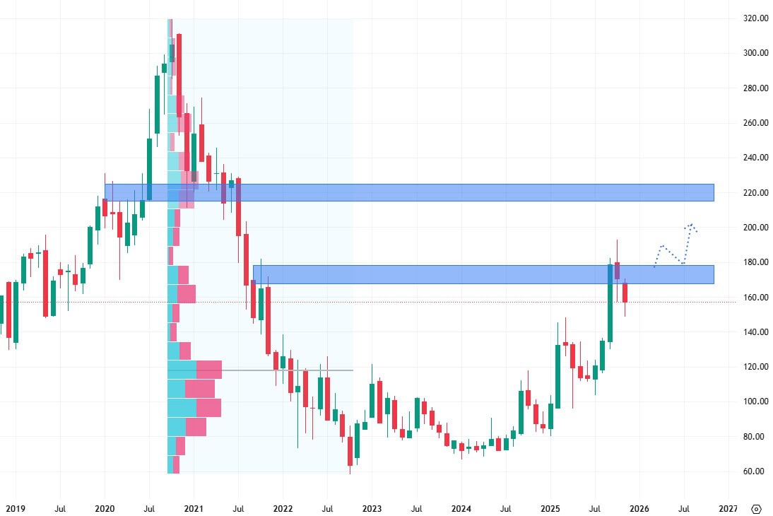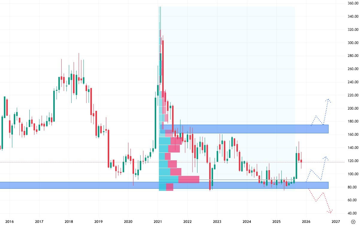 Investorům se může naskytnou zajímavá příležitost buď při průrazu akcií horního pásma, tedy ceny 170 USD, popřípadě akcie pořídit ve slevě na jeho spodní hraně okolo 80 USD za akcii.