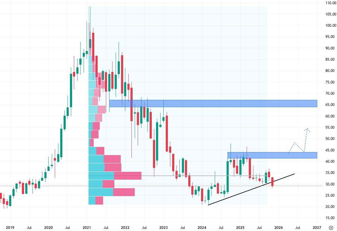 Akcie JD.com se obchodují v down trendu a vypadá to, že je čeká i průraz hodnoty rostoucí trendové čáry. Zde je potřeba počkat na to, jak měsíční svíčka uzavře a zda skutečně dojde k průrazu.
