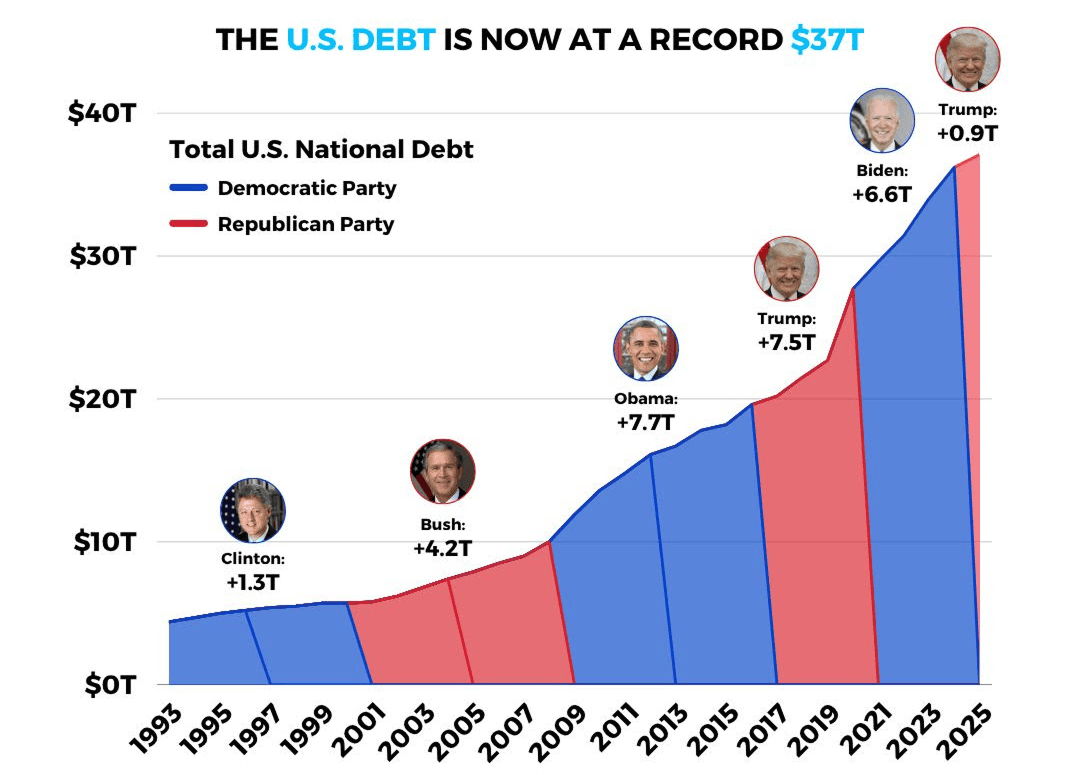 Druhá éra Donalda Trumpa (2025) – V prvních měsících jeho druhého mandátu se dluh zvýšil o dalších 0,9 bilionu USD, přičemž “Big Beautiful Bill” bude hlavním katalyzátorem dalšího zadlužení.