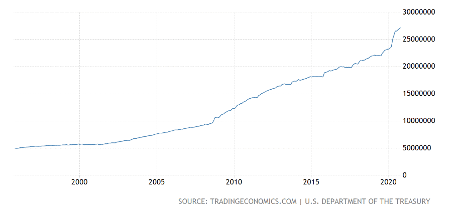 Předposlední graf znázorňuje celkový vývoj vládního dluhu za předešlých dvacet let. Nejaktuálnější data jsou ze září, kdy je celkový dluh 27,13 bilionů dolarů.
