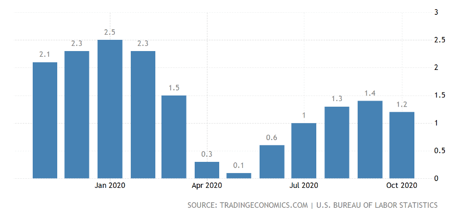 Co se týče míry inflace, ta je aktuálně dle metodiky amerického statistického úřadu 1,2 %. Dá se říct, že se cenová hladina drží při zemi, přestože vládní výdaje stabilně rostou.