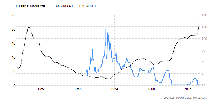 Na přiloženém grafu jde vše krásně vidět. Od začátku 80. let se Spojené státy soustavně zadlužují, až to dospělo tak daleko, že vládní dluh vůči HDP je 128 %. Tím se překonalo relativní zadlužení z konce druhé světové války. Zaregistrujte ovšem, že od začátku 80. let základní úroková sazba jde až na občasné “hiky” jenom dolů. A posledních deset let jsou sazby po větší dobu téměř na nule. Je tu tudíž dlouhodobě negativní korelace mezi mírou zadlužení a úrokovými sazbami.