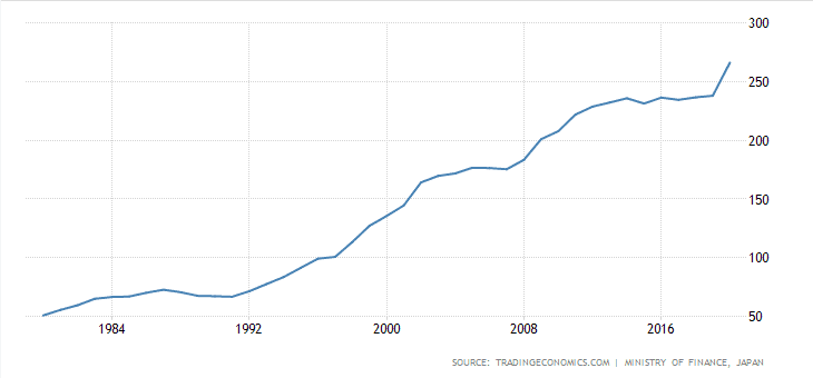 Veřejný dluh Japonská vůči HDP vzrostl za posledních třicet let naprosto extrémně. Ze zhruba 40 % na 266 %. I navzdory tomuto zadlužení byla japonská ekonomika v předešlých třiceti letech mnohokrát v deflaci, někdy i několik let v kuse.
