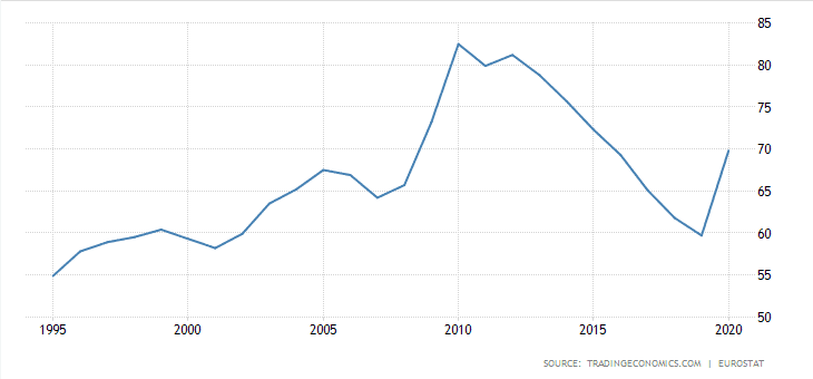 Německo je nejsilnější ekonomika v rámci Evropské unie. Ale i oni mají tendenci se dlouhodobě zadlužovat. Vrchol máme z roku 2010, kdy byl vládní dluh vůči HDP asi 83 %. Od té doby postupně klesal až na 60 %. Mezi lety 2019 a 2020 dluh zase vzrostl na 70 %. Vůbec bych se nedivil, když by dluh za rok 2021 dosáhl úrovní z roku 2010.
