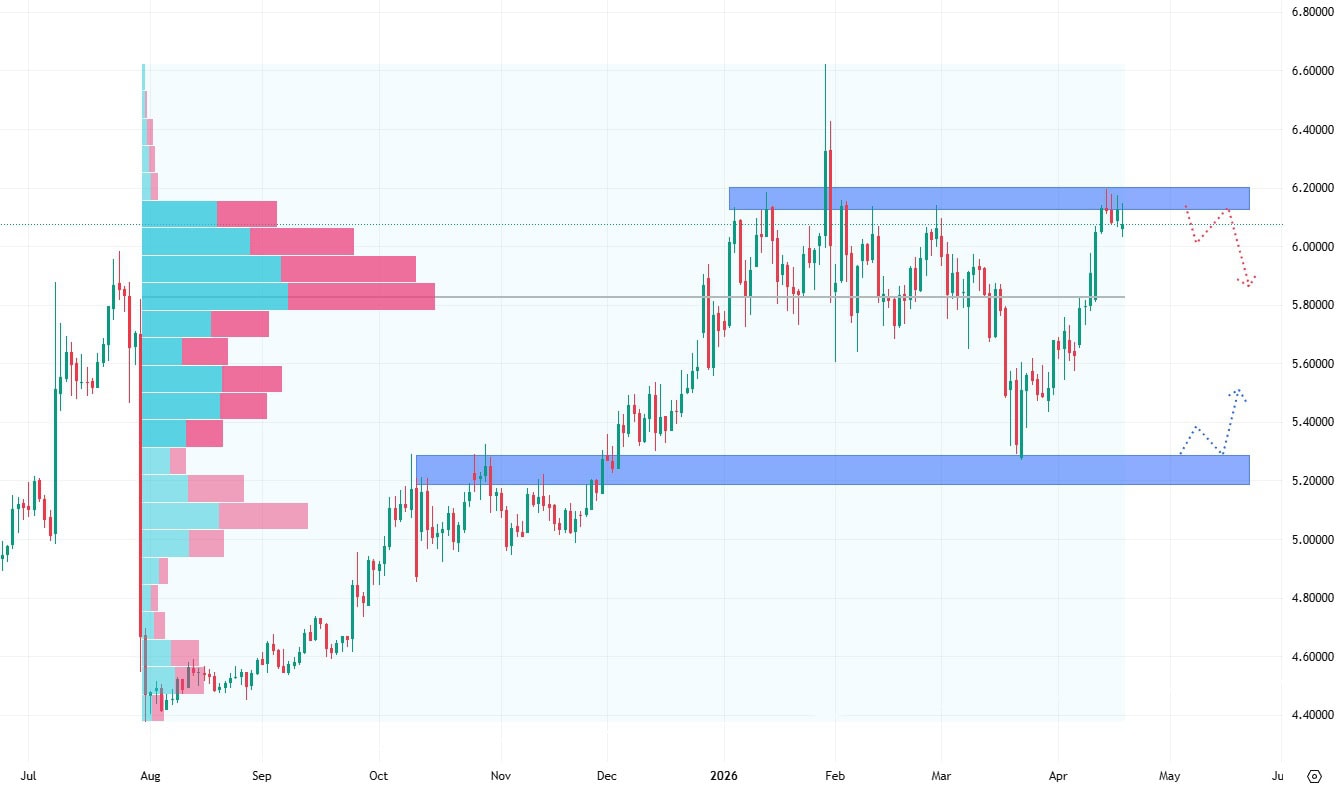 Prostor pro oslabení mědi je tak poměrně výrazný – cena by mohla klesnout minimálně ke spodní hraně postranního trendu, tedy zhruba na úroveň 5,2 USD.