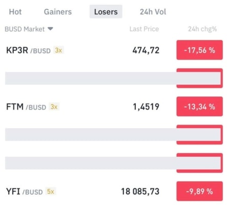 Kryptoměny, se kterými jsou jména vývojářů spojena, se okamžitě dostaly mezi nejvíce ztrátové. Screenshot z burzy Binance