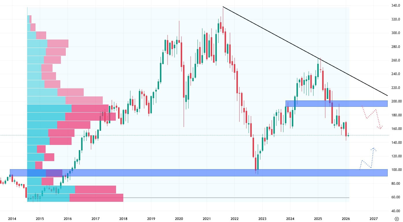 Akcie Adidas se obchodují v klesajícím trendu a v poměrně širokém pásmu, které z horní hrany tvoří rezistence okolo 200 EUR a na spodní hraně se nachází support okolo 100 EUR.