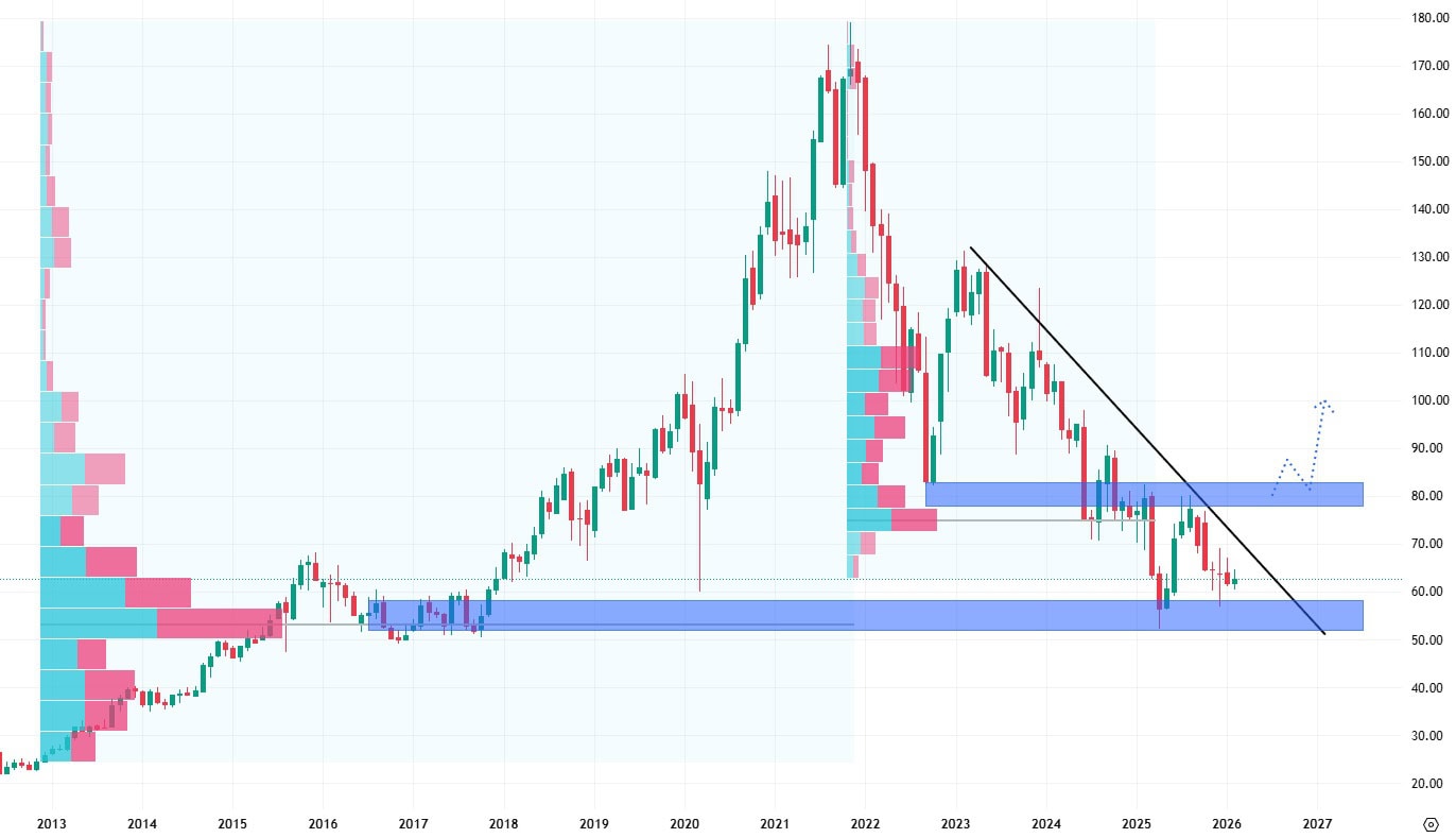 Akcie Nike se také obchodují v klesajícím trendu, ovšem mnohem agresivnějším. V blízké budoucnosti může dojít k retestu supportu na 55 USD. Průraz této cenové úrovně by mohl akcie poslat i na cenová minima z roku 2013.