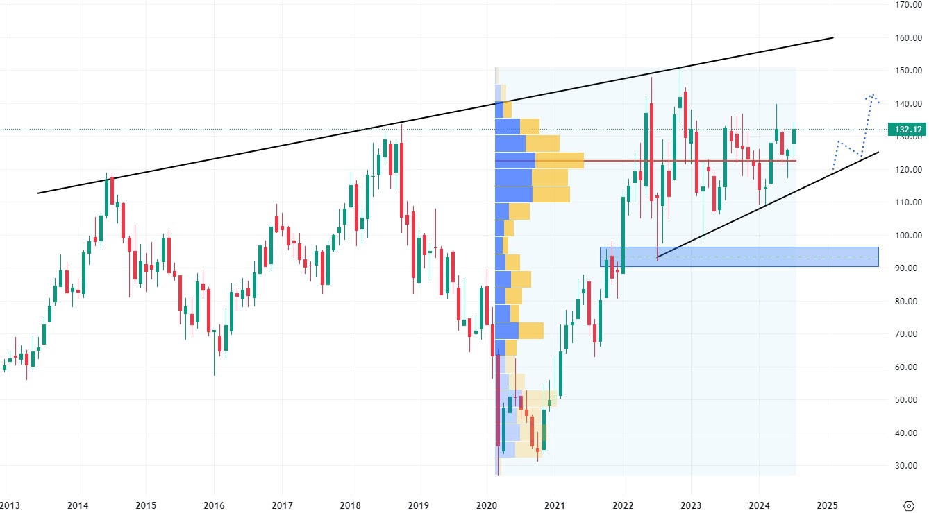 Z dlouhodobého pohledu akcie této společnosti rostou s tím, že se jejich cena pohybuje nad hodnotou rostoucí trendové čáry. Nejbližší rezistencí je tak pro tyto akcie pouze historické maxim na hodnotě 150 USD.