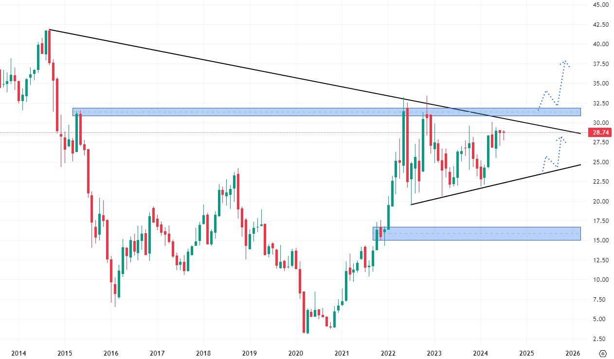 Tato rezistence je platná již více než dva roky, takže akcie potřebují silný fundamentální impuls, aby rezistenci prorazily. Pokles pod hodnotu trendové čáry by pak znamenal změnu sentimentu a zahájení down trendu.