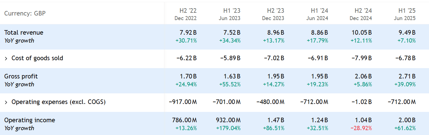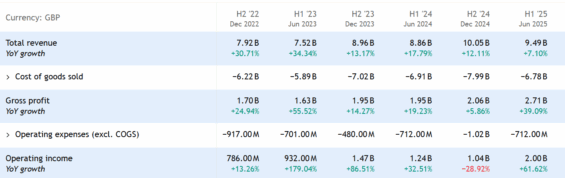 Pozitivní náladu podporují i výsledky za první polovinu roku 2025. Tržby rostly o 7,1 % a dosáhly 9,5 miliardy liber a provozní zisk rostl dokonce o 61 %.