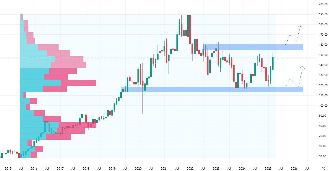 Akcie American Water Works se obchodují spíše směrem do strany, nicméně od roku 2021 se jedná o mírně sestupný trend. Akcie se mohou prozatím vždy opřít o support na ceně 120 USD. V cenovém růstu jim ovšem brání rezistence na 160 USD.