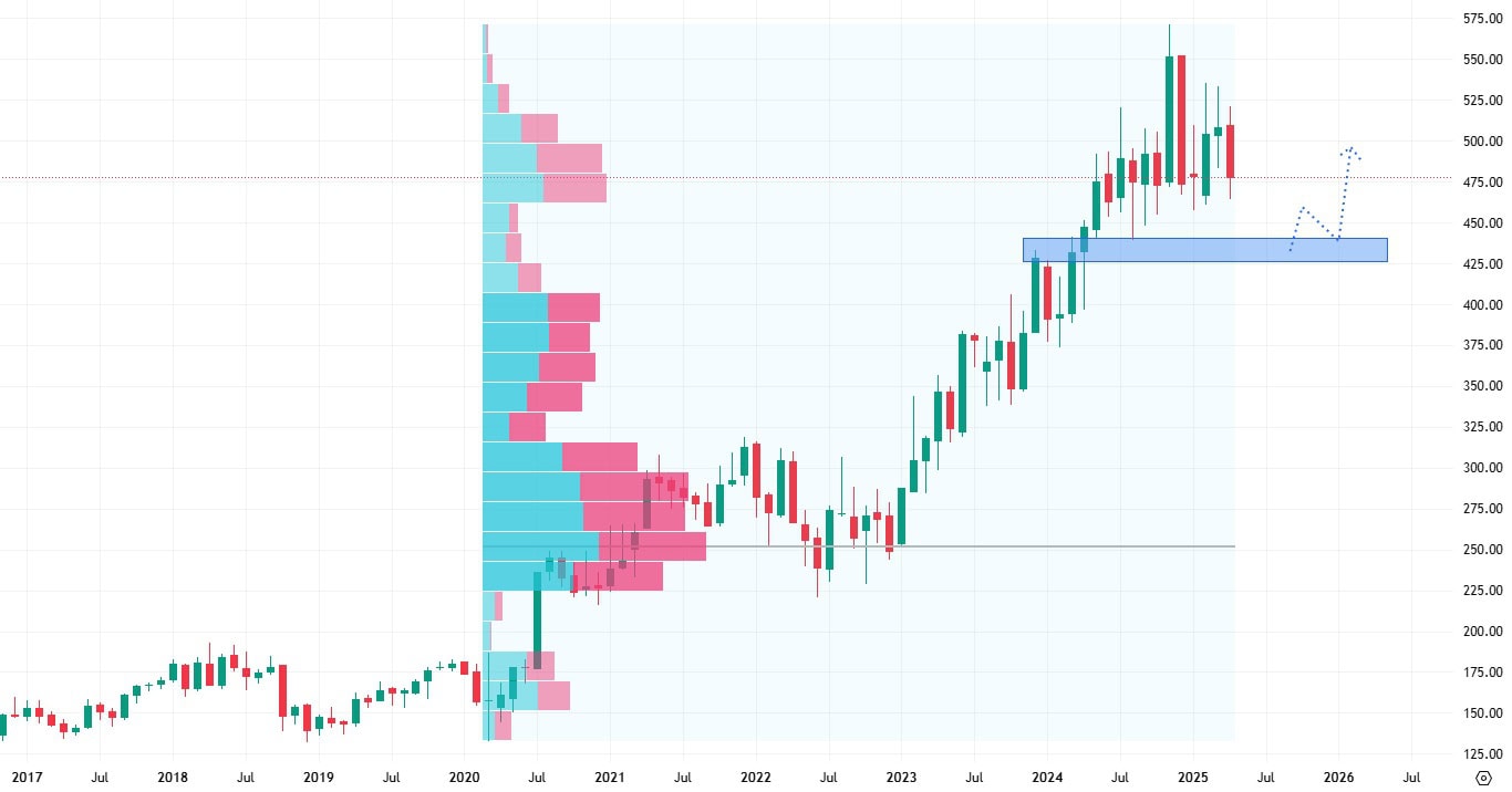 Akcie Watsco se obchodují v dlouhodobém up trendu a to s menšími prodejními korekcemi. Nejbližší support se nachází poměrně blízko aktuální ceně a to na 430 USD za akcii. Průraz tohoto suportu by mohl případně znamenat výraznější pokles.
