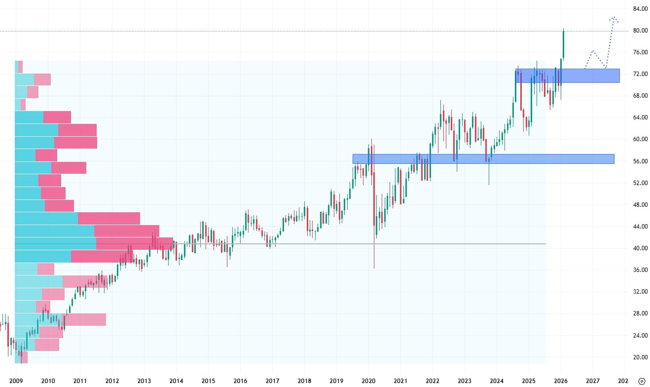 Tento nápojový gigant dosáhl meziročního růstu tržeb o 1,87 % a v podobném stabilním tempu by měl pokračovat i v roce 2026, kdy se tržby odhadují na 48,95 miliardy USD. Růst se očekává také pro rok 2027, kdy by tržby mohly atakovat hranici 50,34 miliardy USD.