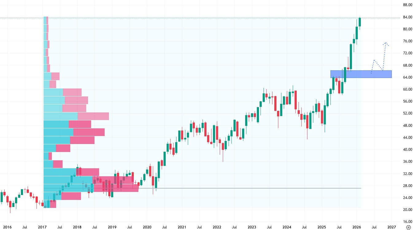 Akcie mají aktuálně nejbližší support na úrovni 65 USD za kus, což přesně odpovídá poslední prodejní korekci, kterou na cenovém grafu vidíme.