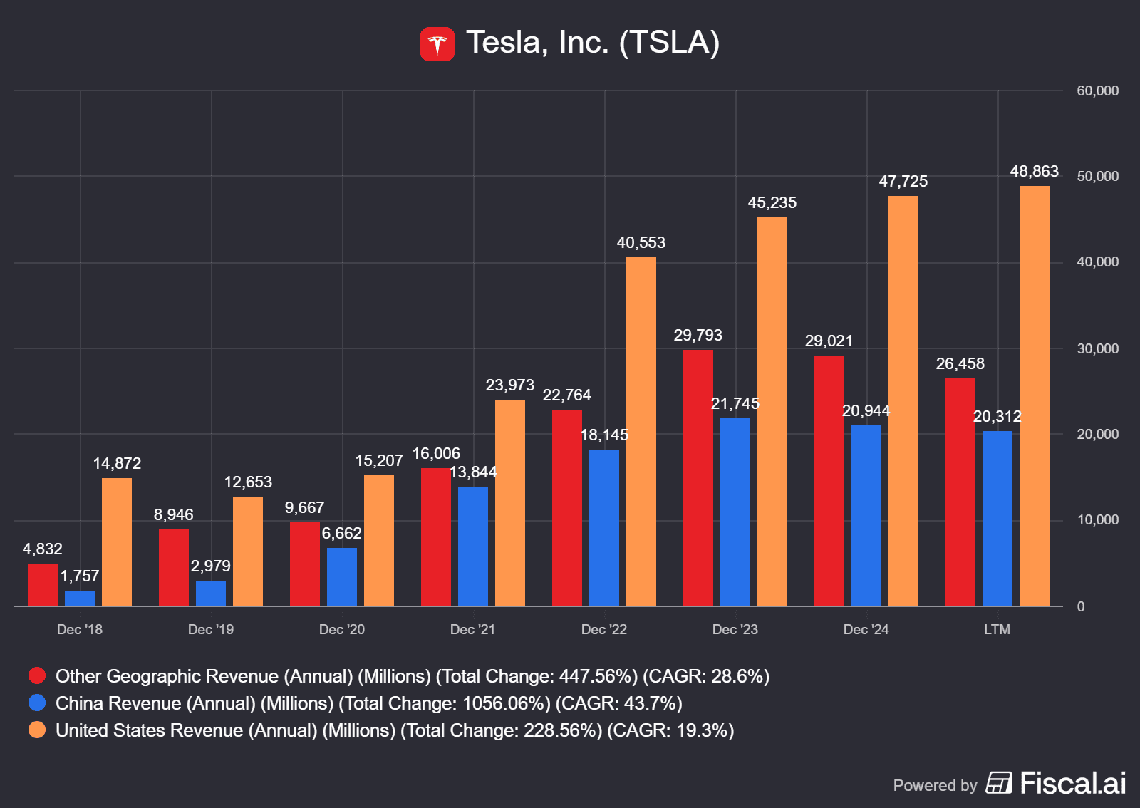 Vývoj tržeb Tesly v jednotlivých regionech
