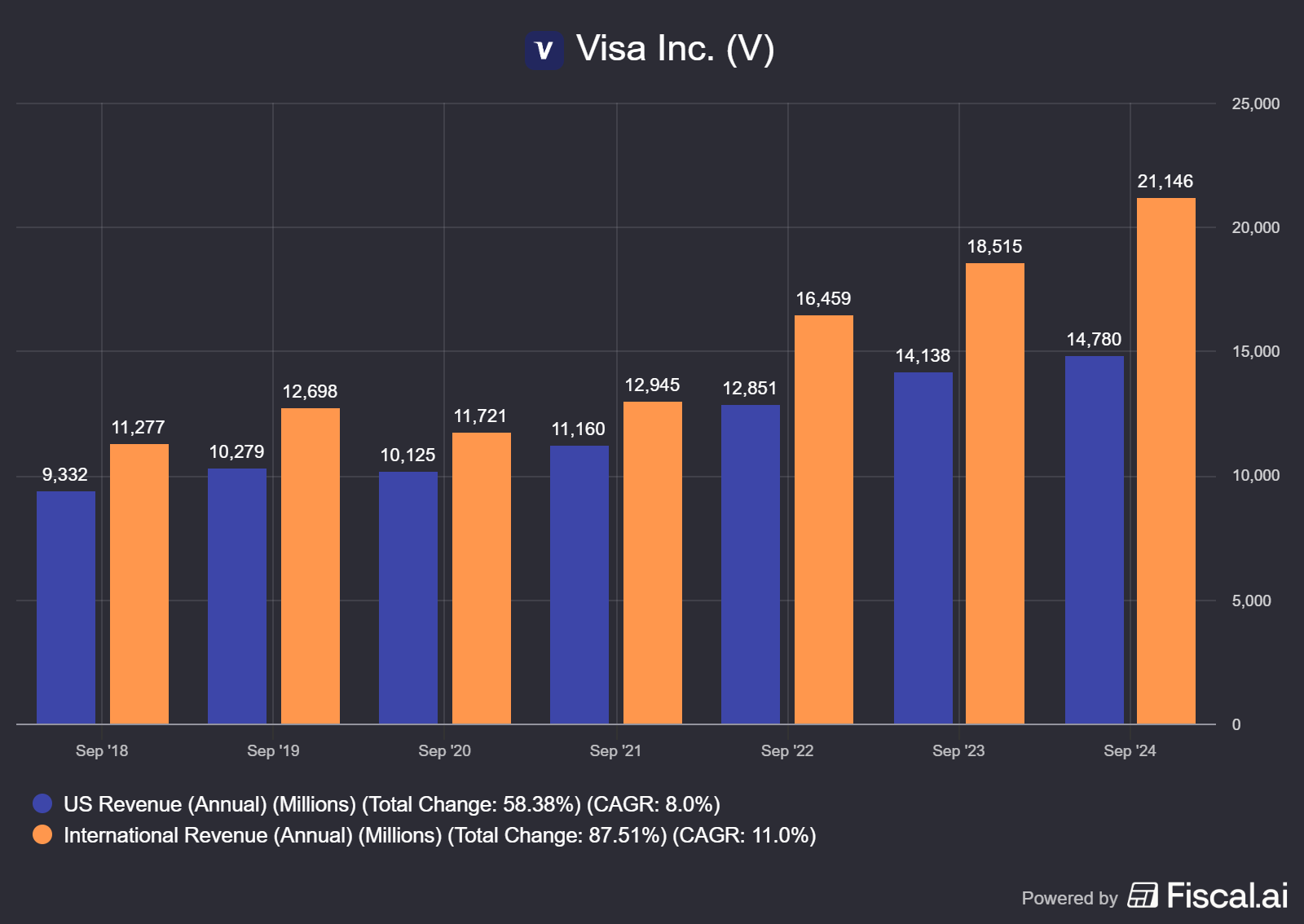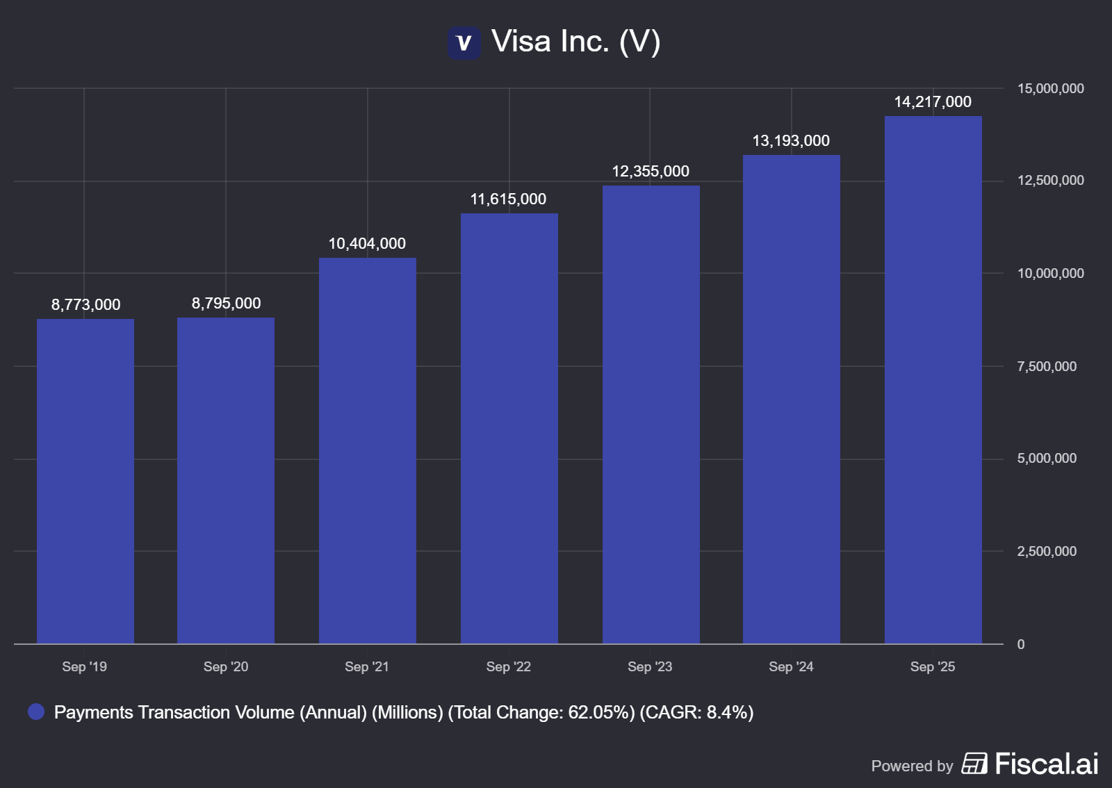 Při zveřejnění hospodářských výsledků za druhý kvartál Visa odhalila, že objem plateb realizovaných prostřednictvím společnosti vzrostl meziročně o 8 % a tržby rostly 14% tempem.