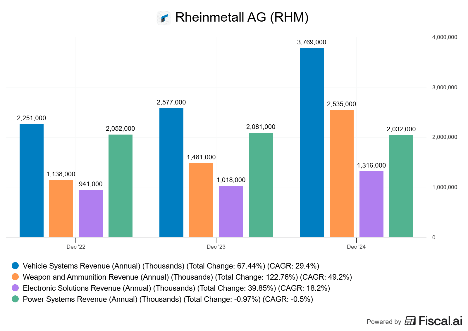 Rheinmetall je dnes v praxi vertikálně integrovaný dodavatel pro moderní válku na zemi, ale také ve vzduchu, vesmíru a na moři. Motorem růstu je zejména dělostřelecká a tanková munice spolu s obrannými systémy.