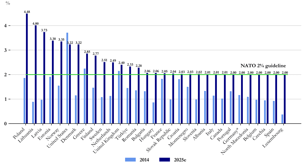 Roky míru a spoléhání se na vojenskou sílu USA ovšem vedly k zanedbávání tohoto závazku, což se nyní mění. Mnoho zemí chce navíc navýšit investice do obrany nad povinný závazek a cílí až na 5 % HDP.