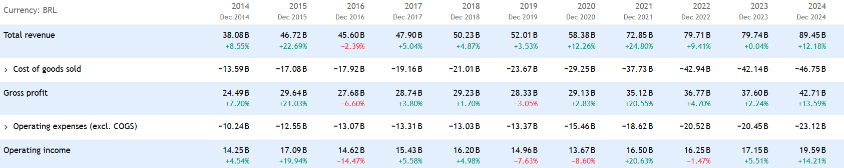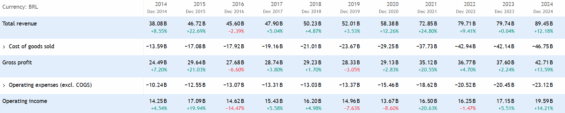 Silná pozice se odráží v kontinuálním růstu tržeb, který v roce 2024 dosáhl 12 %. Níže uvedená tabulka ukazuje tržby v brazilském realu.