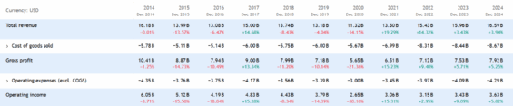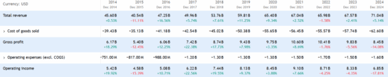 Pro srovnání si ukážeme i vývoj tržeb po přepočtu na americký dolar, kde vývoj tržeb již tak kontinuálně nevypadá a to díky kurzovým přepočtům. Vliv kurzu je jedním z rizik, na které je potřeba při investici do této firmy myslet.