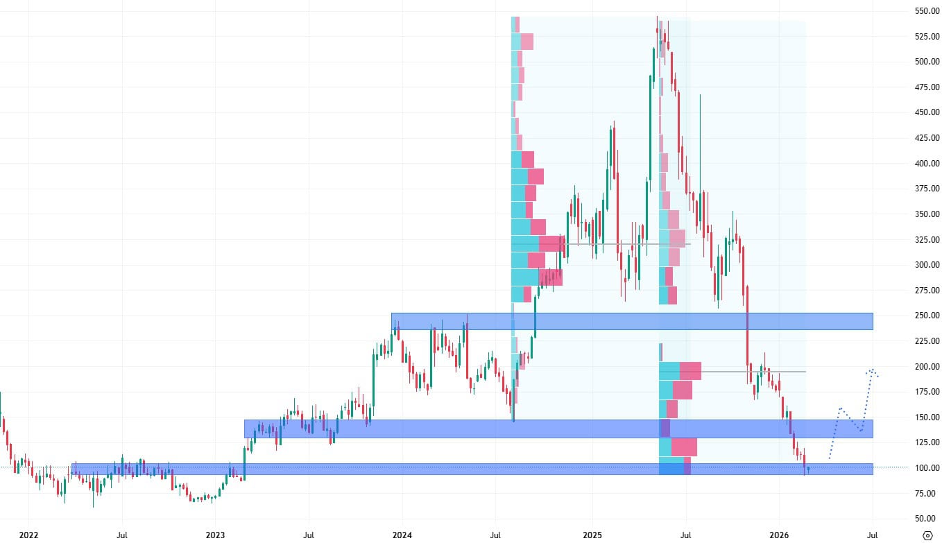 Akcie Duolinga se aktuálně nacházejí v agresivním cenovém poklesu a testují hodnotu pravděpodobně posledního supportu. Tím dalším v pořadí by totiž bylo už jen absolutní cenové minimum.