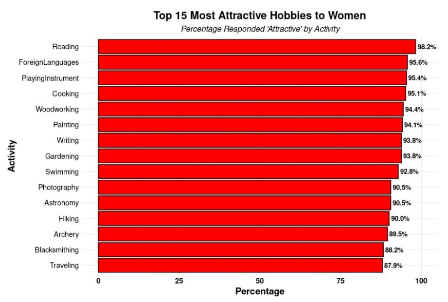 Mezi desítkou nejatraktivnějších koníčků se na prvním místě umístilo čtení, které za přitažlivé označilo 98,2 % respondentek. Ženy si také nemohou vynachválit, když mají muži jako koníčka cizí jazyky, hraní na hudební nástroj nebo vaření. Tyto aktivity shledává přitažlivými více než 95 % žen.