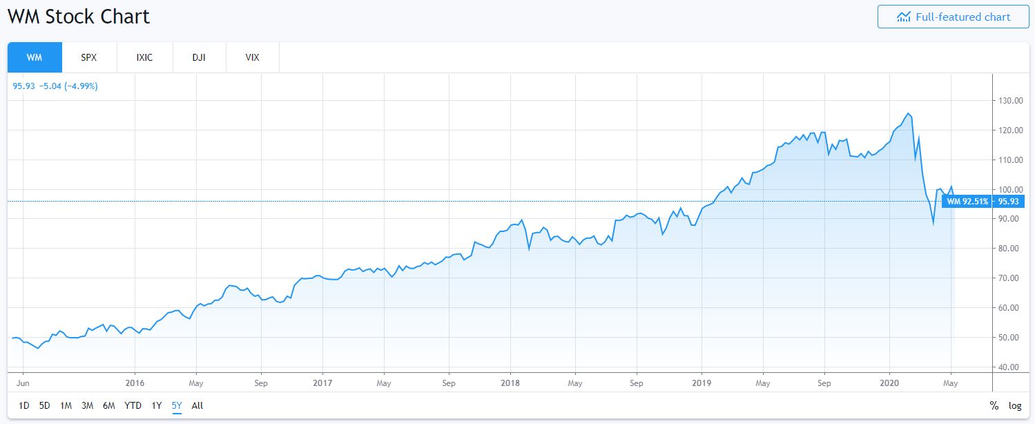 Vývoj akcií Waste Management za posledních pět let