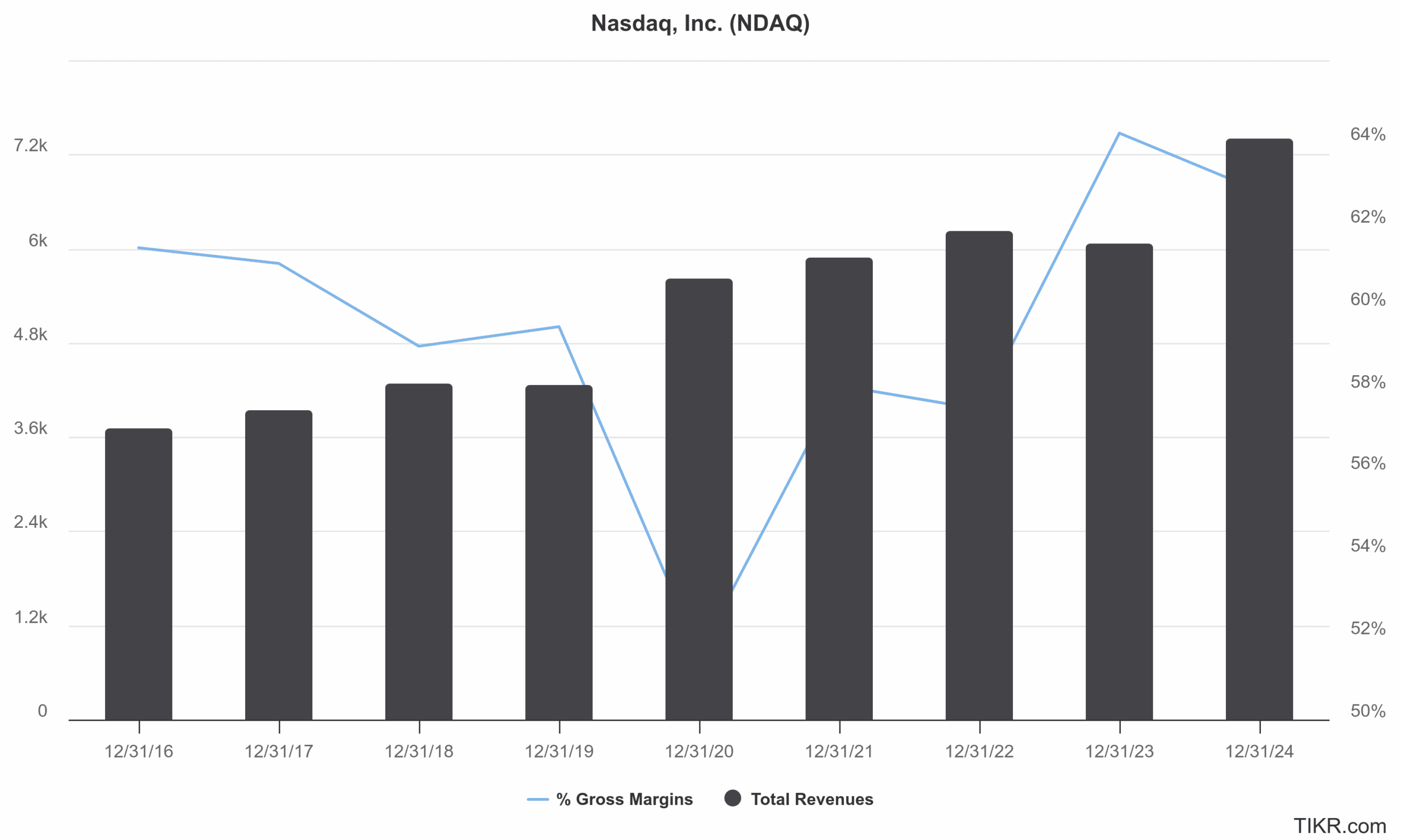 V roce 2024 vykázal Nasdaq výnosy ve výši 7,4 miliardy dolarů, což představuje 22% nárůst oproti předchozímu roku.
