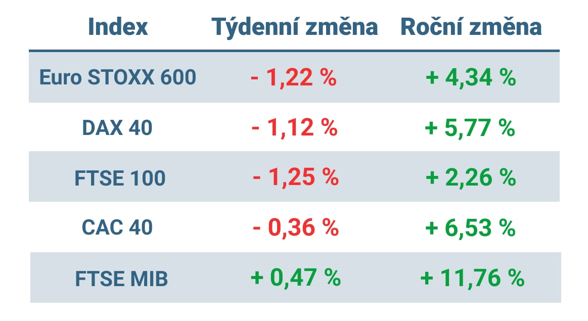 Tabulka ukazuje vývoj nejvýznamnějších evropských indexů v tomto týdnu a v roce 2024
