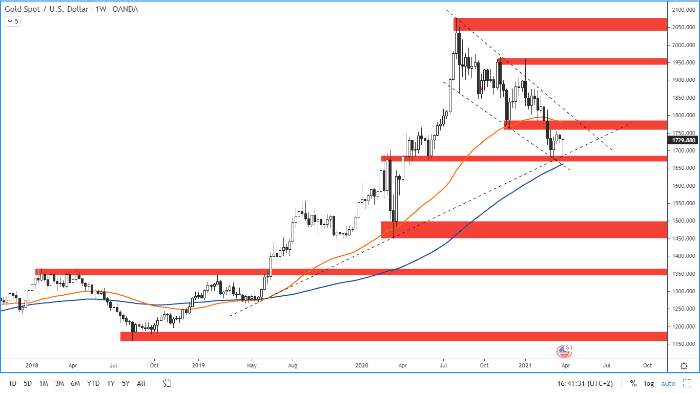 Tento support pak byl znovu otestován 30. 3. 2021. Poslední březnový den pak cena zlata začala růst. Důvodem pro tento růst by mohlo být vybírání zisků na konci čtvrtletí.