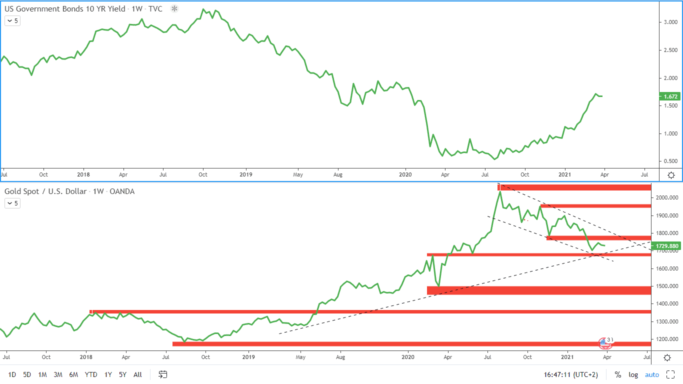 V době růstu výnosů dlouhodobých amerických dluhopisů zažívá zlato horké chvilky. Vůči historicky nejvyšší ceně zlata 2.075 USD za trojskou unci, které zlato dosáhlo v srpnu 2020, se aktuálně zlato obchoduje přibližně s 15% slevou. Výprodeje byly motivovány tím, že zlato, na rozdíl od amerických vládních dluhopisů, nenese žádný průběžný výnos.