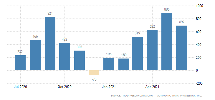 Druhý graf znázorňuje nové zaměstnanecké posty v absolutních hodnotách za jednotlivé měsíce. Červen mírně předčil očekávání a povedlo se vytvořit na 692 000 nových pracovních míst. Z grafu dále vyplývá určitá korelace mezi počty nových pracovních míst a inflací.