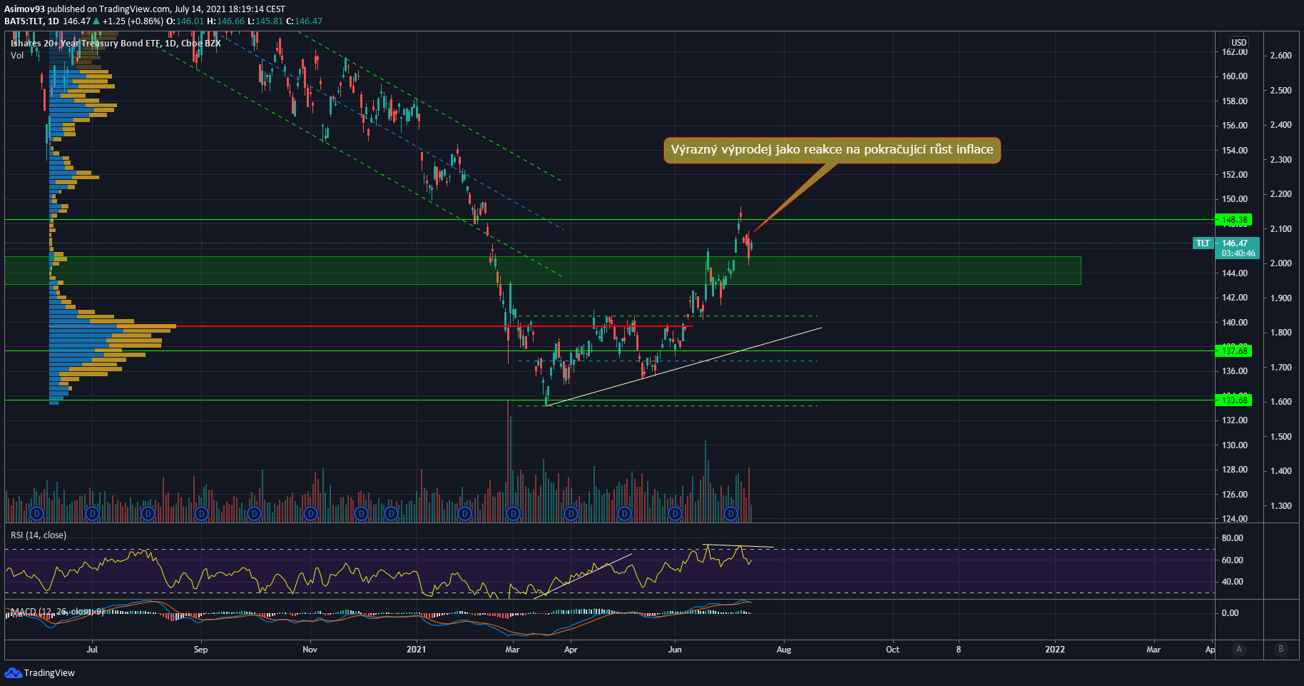 Dluhopisový trh je i nyní ve velmi silné pozici a potvrzuje teze, že vysoká inflace je pouze přechodného charakteru (investoři dluhopisů tomu věří a jsou silní). Všimněte si, jak trh reagoval na zveřejnění červnové inflace – 2% denní pokles. Obdobný drop tu nebyl několik měsíců. Na druhou stranu se cena drží nad klíčovým pásmem 144 USD, takže nově započatá expanze pořád platí.