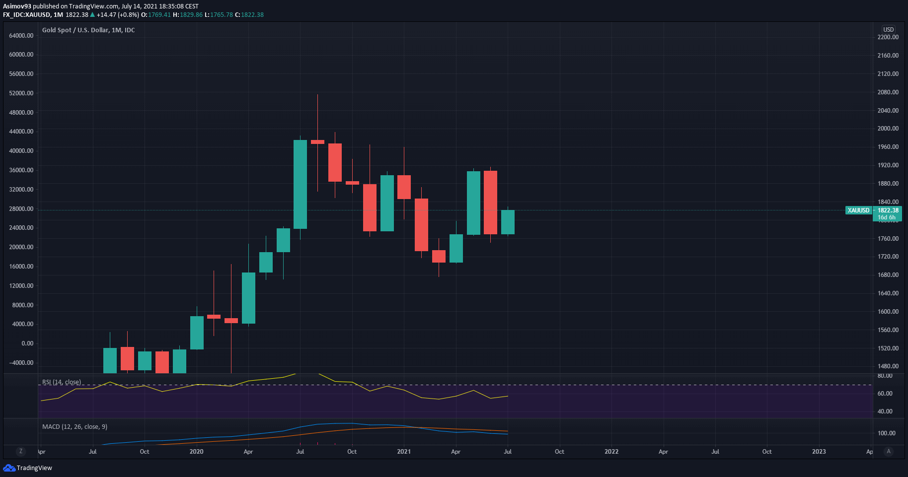 Měsíční graf pro zlato (XAU/USD). Zdroj: tradingview.com