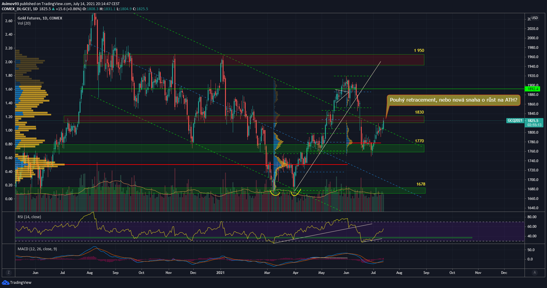 Nakupujícím se čerstvě podařilo prorazit skrze horní stěnu klíčového regresního kanálu. Dnes býci zaútočili na důležitý S/R level 1 830 USD a pořád se o něj bojuje. Jestli nakupující hladinu prorazí, technicky se situace překlopí ve prospěch dalšího růstu. Tím chci říct, že proražením řečeného levelu se expanze povýší z pouhého retracementu na skutečnou snahu o dosažení nového all time high.