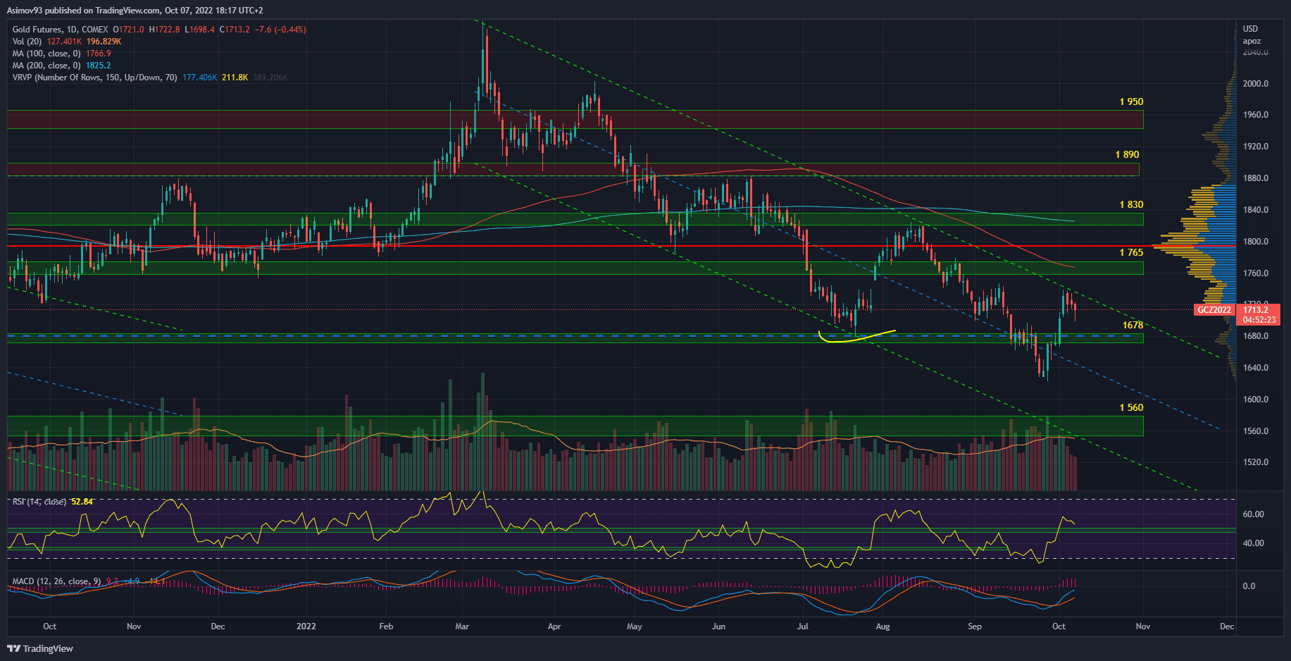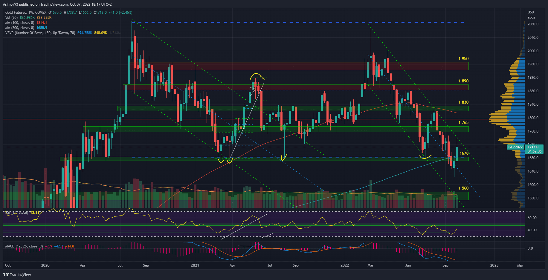 Týdenní svíce z minulého týdne zavřela ve velmi slušné podobě. Ovšem objemy nebyly nic moc a hlavně close týdne skončilo právě pod 1 678 USD/unce. A je navíc běžné, že po průlomu supportu dojde k retestu zespoda. Tím se z bývalé podpory stane zase rezistence. Avšak v nynějším týdnu kurzový růst pokračoval. Díky tomu se trh se zlatem dostal definitivně zpátky nad klíčový support.