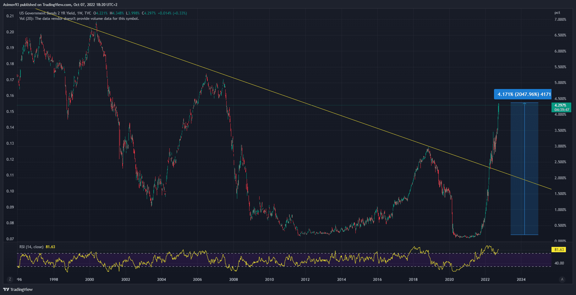 A právě dluhopisový trh má, co se týče výnosů, velké pré. Výnosy na krátkodobých splatnostech (dvouleté) nyní dosahují úrovní z roku 2007. A vzhledem k současné měnové politice Federálního rezervního systému, se asi nad 5 % podíváme. A čím výš výnosy porostou, tím hůře pro zlato. Je třeba si uvědomit, že dluhopisy kupují instituce ve velkých objemech. A pro ně jsou to potom “easy money”.