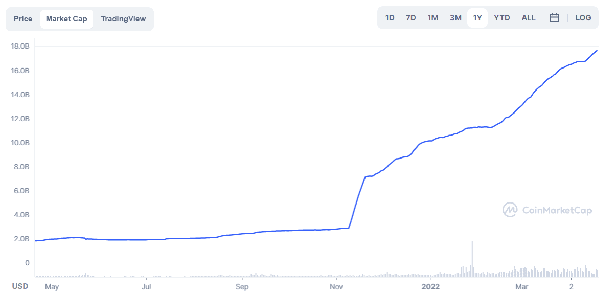 Když se podíváme na graf tržní kapitalizace TerraUSD, můžeme si všimnout, že zažila v posledních měsících ohromný růst – od poloviny listopadu se zvýšila o 525 %.