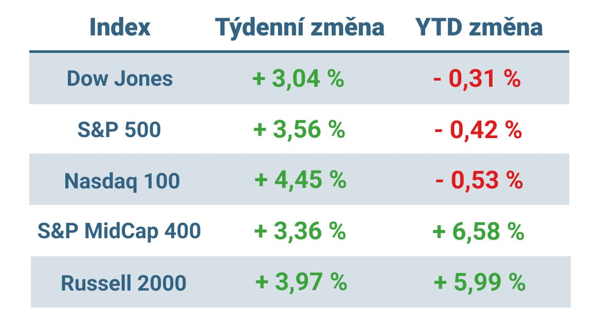 Americké akcie mají za sebou skutečně silný týden. Dow Jones posílil o 3,04 %, širší S&P 500 přidal 3,56 % a technologický Nasdaq 100 vyskočil dokonce o 4,45 %. Je vidět, že se chuť riskovat vrací hlavně k technologiím.
