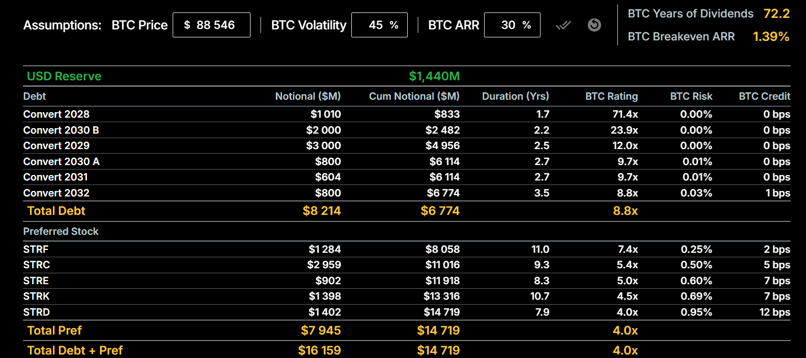 Po poklesu ceny minulý měsíc firma na síti X uvedla, že i při návratu Bitcoinu k průměrné nákupní ceně kolem 74 000 dolarů zůstává krytí konvertibilního dluhu dostatečné.