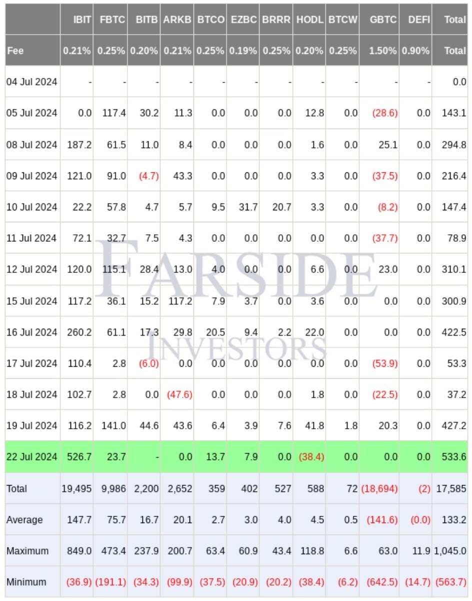 Právě bitcoinové ETFs jsou tento týden v kurzu. Největší americký fond, BlackRock iShares Bitcoin Trust (IBIT), zaznamenal jen 22. července inflows ve výši 526 milionů USD. Celkové inflows do amerických spotových ETFs činily ve stejný den 533,6 milionu USD. To je nejvíce od března letošního roku.