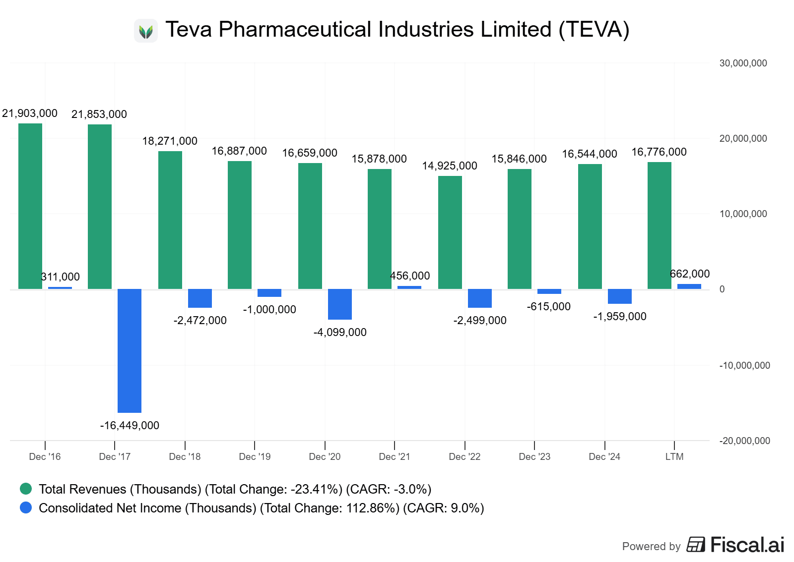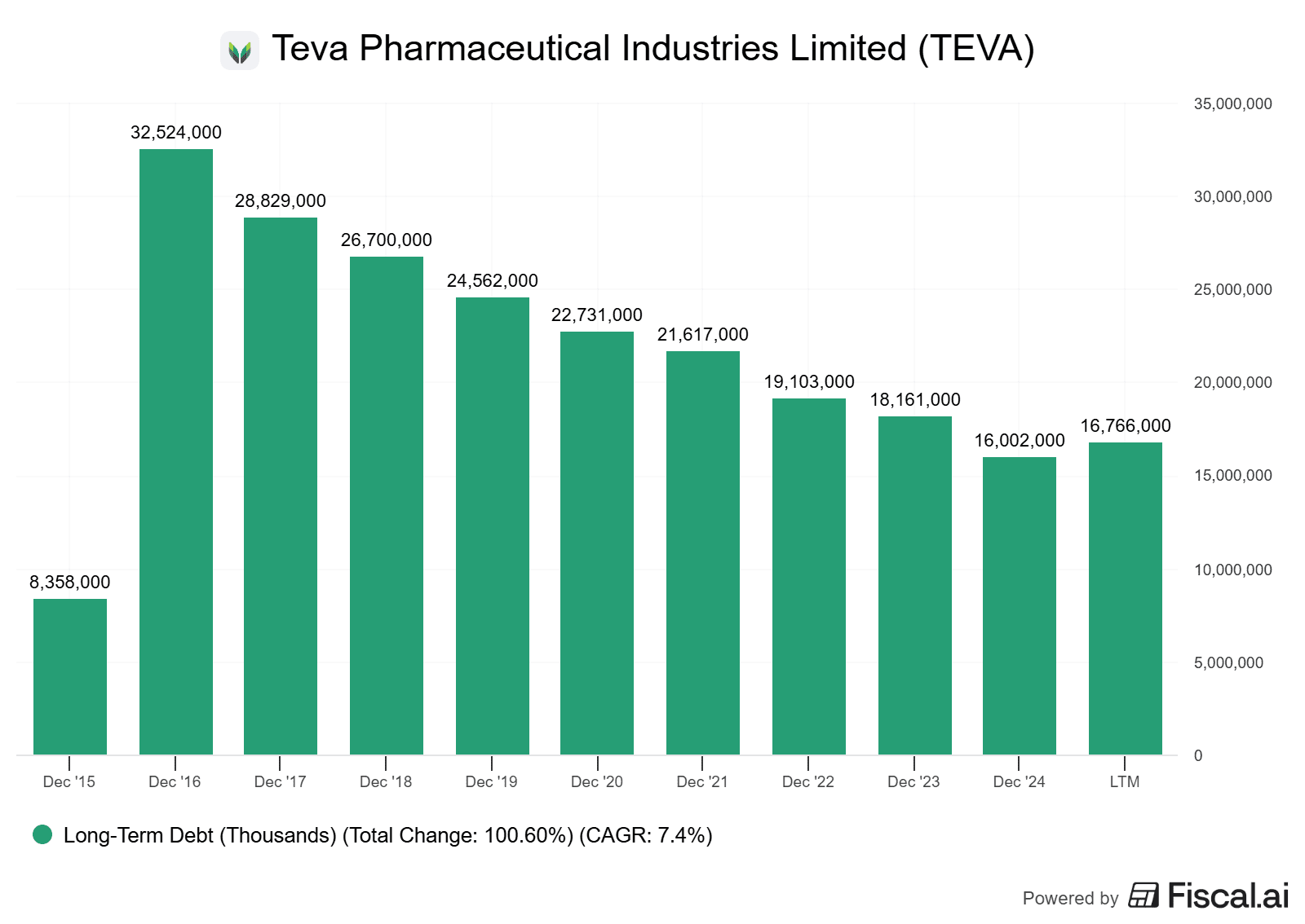 Finanční zdraví Tevy se od akvizice společnosti Actavis v roce 2016 také zlepšilo. Vlivem akvizice narostl dluh na 32 miliard dolarů.