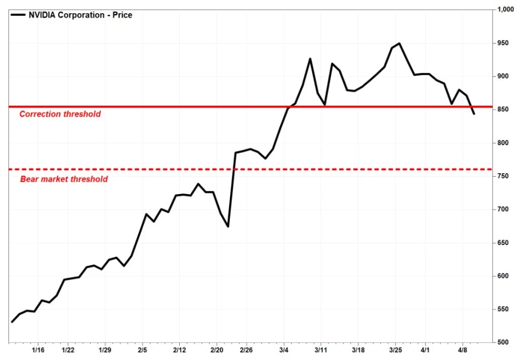 Akcie výrobce čipů nejvíce těžícího z boomu umělé inteligence během úterního obchodování klesly o 2 % a zakončily den na 853,54 USD. Protože skončily pod úrovní 855,02 USD, vstoupily do korekce, kterou investoři obvykle definují jako pokles o 10 % až 20 % od maxima býčího trhu.