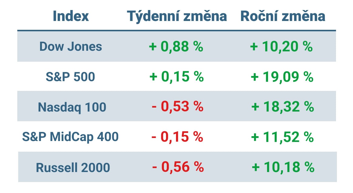 Tabulka ukazuje vývoj nejvýznamnějších amerických indexů v tomto týdnu a v roce 2024