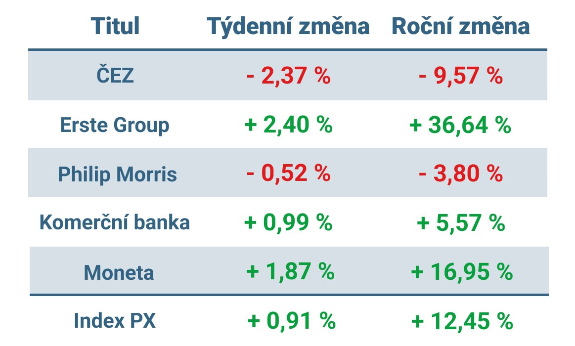 Zmíněné akcie ČEZ v týdnu odepsaly přibližně 2,5 % a letošní ztrátu tak prohloubily na téměř 10 %. Na opačné straně spektra nalezneme akcie Erste Group, které si podobnou hodnotu připsaly.